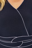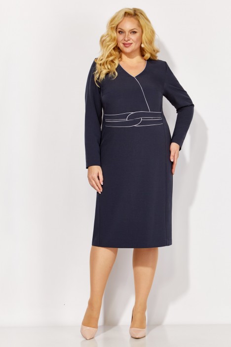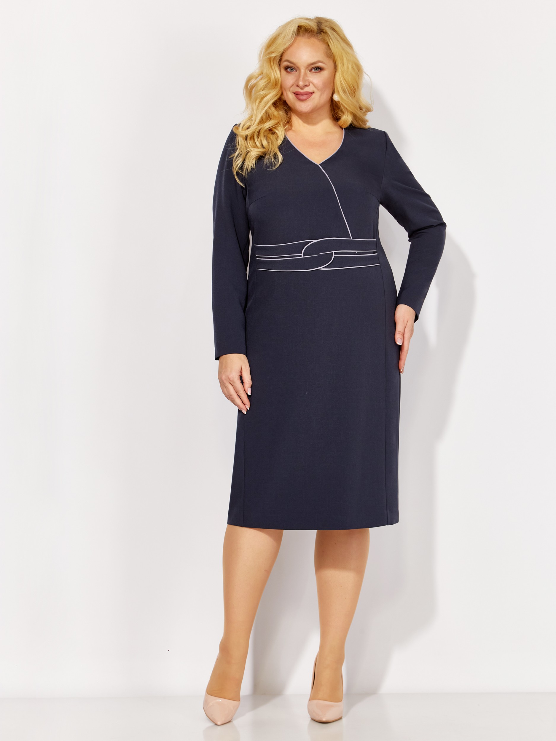 Описание: Повседневное платье на рост 164 см полуприлегающего силуэта средней длины за колено. Вырез горловины V-образный с имитацией запаха и контрастными кантами вдоль срезов. Рукав втачной длинный. Перед платья с бочками и нагрудными вытачками из них. Спинка со средним швом, потайной застежкой-молнией и шлицей. Перед платья дополнен декоративным поясом с контрастными перекантами.